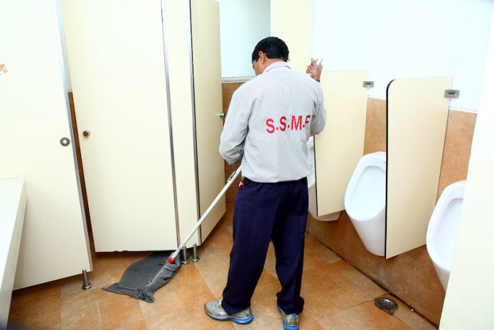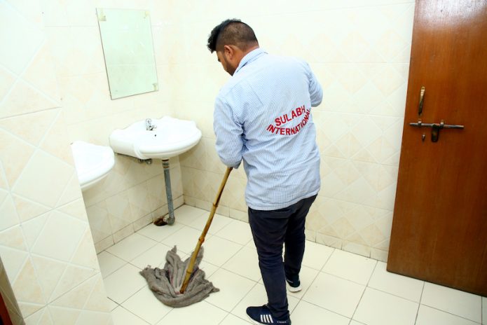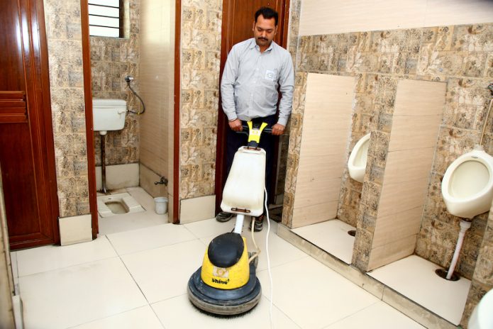 - Scrub and mop the washroom floor from inside to outside.